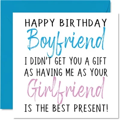MAKE THEM SMILE WITH THIS HILARIOUS HAPPY BIRTHDAY CARD: This exceptional quality birthday card for him shows the design "Happy Birthday Boyfriend, I didn't get you a Gift as having me as your Girlfriend is the best Present!". If you are looking for funny birthday greetings cards for him then this happy birthday card is bound to make them laugh. Not just for birthday day gifts for Boyfriend this could also be for Boo, Lover, Fiance, Husband-To-Be, partner WHAT DO YOU GET: The card is printed on one side and BLANK ON THE INSIDE to allow you to write your very own message. The unique fun design is printed on a specially sourced and environmentally responsible board. At 360 microns thick the natural white one-sided gloss board has a quality look and feel. Supplied with a coloured gummed envelope to complement the design and ready to be sealed and sent in the post. NO INK SMUDGES: There is nothing worse than writing inside a card to find that the shiny surface makes the ink smudge. This is why we use a high quality one sided coated board. The uncoated side will absorb more of the ink from your pen to make smudging a thing of the past. Happy birthday Boyfriend Birthday cards. 21st birthday gifts for partner SIZES: Greeting Card = 145mm x 145mm, Envelope = 155mm x 155mm, Card Thickness = 360 micron. Great Birthday Cards from Girlfriend, Fiancee, Lover birthday cards from Partner 18th birthday card. MADE AND QUALITY CHECKED IN THE UK: We print and manufacture all our product right here in the UK so you can be sure of a fast turnaround and a product that is expertly made. Using environmentally responsible premium board our card is conscious of the responsible management of the world's forests - birthday cards Boyfriend, Girlfriend, Husband, Wife Fiance Fiancee Special birthday card.