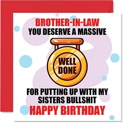 MAKE YOUR BROTHER IN LAW SMILE WITH THIS HILARIOUS HAPPY BIRTHDAY CARD: This exceptional quality birthday card for him shows the design "Brother-in-Law You deserve a massive Well done for putting up with my sisters bullshit Happy Birthday". If you are looking for beautiful birthday greetings cards for him, then this happy birthday card is bound to make them laugh. Not just for birthday gifts for Brother this could also be a birthday card for Brother. WHAT DO YOU GET: The card is printed on one side and BLANK ON THE INSIDE to allow you to write your very own message. The unique fun design is printed on a specially sourced and environmentally responsible board. At 360 microns thick the natural white one-sided gloss board has a quality look and feel. Supplied with a coloured gummed envelope to complement the design and ready to be sealed and sent in the post. NO INK SMUDGES: There is nothing worse than writing inside a card to find that the shiny surface makes the ink smudge. This is why we use a high quality one sided coated board. The uncoated side will absorb more of the ink from your pen to make smudging a thing of the past. Happy birthday Brother cards, Brother birthday cards. SIZES: Greeting Card = 145mm x 145mm, Envelope = 155mm x 155mm, Card Thickness = 360 micron. Great Brother birthday cards from Sister or Brother. Brother birthday cards from Sister, birthday cards for Son, birthday card Son, Brother birthday cards from Sister, Brother cards birthday, special Brother birthday cards, Brother 18th birthday card, birthday card Brother from Sibling. MADE AND QUALITY CHECKED IN THE UK: We print and manufacture all our product right him in the UK so you can be sure of a fast turnaround and a product that is expertly made. Using environmentally responsible premium board our card is conscious of the responsible management of the world's forests - birthday cards Brother, birthday card Brother, Step Brother birthday card, Brothers birthday card.