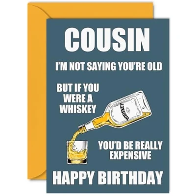 MAKE YOUR COUSIN SMILE WITH THIS HILARIOUS HAPPY BIRTHDAY CARD COUSIN: This exceptional quality birthday card for him or her shows the design "I'm not saying you're old but if you were a whiskey you'd be really expensive Happy birthday". If you are looking for beautiful birthday greetings cards for him or her, then this funny happy birthday card is bound to make them smile. Not just for birthday gifts for cousin this could also be a birthday card for your family relative. WHAT DO YOU GET: The card is printed on one side and BLANK ON THE INSIDE to allow you to write your very own message. The unique fun design is printed on a specially sourced and environmentally responsible board. At 360 microns thick the natural white one-sided gloss board has a quality look and feel. Supplied with a coloured gummed envelope to complement the design and ready to be sealed and sent in the post. NO INK SMUDGES: There is nothing worse than writing inside a card to find that the shiny surface makes the ink smudge. This is why we use a high quality one sided coated board. The uncoated side will absorb more of the ink from your pen to make smudging a thing of the past. Happy birthday Cousin cards, Cousin birthday card, Step Cousin birthday cards, 20th birthday card for him, 20th birthday cards for women. SIZES: Greeting Card = 148mm x 210mm, Envelope = 150mm x 212mm, Card Thickness = 360 micron. Great Cousin birthday cards from Cousin. Cousin birthday cards from family, birthday card Cousin , Cousin birthday card, special Cousin birthday cards. MADE AND QUALITY CHECKED IN THE UK: We print and manufacture all our product right her in the UK so you can be sure of a fast turnaround and a product that is expertly made. Using environmentally responsible premium board our card is conscious of the responsible management of the world's forests.