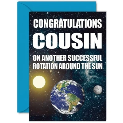 MAKE YOUR COUSIN LAUGH WITH THIS FUNNY BIRTHDAY CARD COUSIN: This exceptional quality birthday card for him or her shows the design "Congratulations On Another Successful Rotation Around The Sun". If you are looking for beautiful birthday greetings cards for him or her, then this funny happy birthday card is bound to make them smile. Not just for birthday gifts for cousin this could also be a birthday card for your family relative. WHAT DO YOU GET: The card is printed on one side and BLANK ON THE INSIDE to allow you to write your very own message. The unique fun design is printed on a specially sourced and environmentally responsible board. At 360 microns thick the natural white one-sided gloss board has a quality look and feel. Supplied with a coloured gummed envelope to complement the design and ready to be sealed and sent in the post. NO INK SMUDGES: There is nothing worse than writing inside a card to find that the shiny surface makes the ink smudge. This is why we use a high quality one sided coated board. The uncoated side will absorb more of the ink from your pen to make smudging a thing of the past. Happy birthday Cousin cards, Cousin birthday card, Step Cousin birthday cards, 20th birthday card for him, 20th birthday cards for women. SIZES: Greeting Card = 148mm x 210mm, Envelope = 150mm x 212mm, Card Thickness = 360 micron. Great Cousin birthday cards from Cousin. Cousin birthday cards from family, birthday card Cousin , Cousin birthday card, special Cousin birthday cards. MADE AND QUALITY CHECKED IN THE UK: We print and manufacture all our product right her in the UK so you can be sure of a fast turnaround and a product that is expertly made. Using environmentally responsible premium board our card is conscious of the responsible management of the world's forests - birthday cards Cousin, Cousin birthday card, Cousins birthday card.