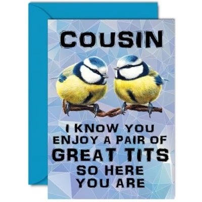 MAKE YOUR COUSIN SMILE WITH THIS HILARIOUS HAPPY BIRTHDAY CARD COUSIN: This exceptional quality birthday card for him or her shows the design "I Know You Enjoy A Pair Of Great Tits So Here You Are". If you are looking for beautiful birthday greetings cards for him or her, then this funny happy birthday card is bound to make them smile. Not just for birthday gifts for cousin this could also be a birthday card for your family relative. WHAT DO YOU GET: The card is printed on one side and BLANK ON THE INSIDE to allow you to write your very own message. The unique fun design is printed on a specially sourced and environmentally responsible board. At 360 microns thick the natural white one-sided gloss board has a quality look and feel. Supplied with a coloured gummed envelope to complement the design and ready to be sealed and sent in the post. NO INK SMUDGES: There is nothing worse than writing inside a card to find that the shiny surface makes the ink smudge. This is why we use a high quality one sided coated board. The uncoated side will absorb more of the ink from your pen to make smudging a thing of the past. Happy birthday Cousin cards, Cousin birthday card, Step Cousin birthday cards, 20th birthday card for him, 20th birthday cards for women. SIZES: Greeting Card = 148mm x 210mm, Envelope = 150mm x 212mm, Card Thickness = 360 micron. Great Cousin birthday cards from Cousin. Cousin birthday cards from family, birthday card Cousin , Cousin birthday card, special Cousin birthday cards. MADE AND QUALITY CHECKED IN THE UK: We print and manufacture all our product right her in the UK so you can be sure of a fast turnaround and a product that is expertly made. Using environmentally responsible premium board our card is conscious of the responsible management of the world's forests - birthday cards Cousin, Cousins birthday card.