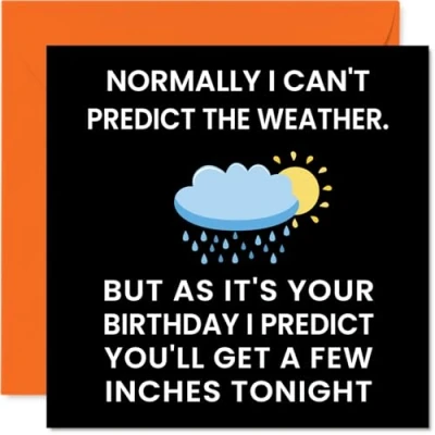 MAKE YOUR PARTNER SMILE WITH THIS HILARIOUS HAPPY BIRTHDAY CARD: This exceptional quality birthday card for her shows the design "Normally I can't predict the weather. But as it's your Birthday I predict you'll get a few inches tonight". If you are looking for beautiful birthday greetings cards for her, then this happy birthday card is bound to make them laugh. Not just for birthday gifts for Girlfriend this could also be an Anniversary card or Valentines Day card for Girlfriend. WHAT DO YOU GET: The card is printed on one side and BLANK ON THE INSIDE to allow you to write your very own message. The unique fun design is printed on a specially sourced and environmentally responsible board. At 360 microns thick the natural white one-sided gloss board has a quality look and feel. Supplied with a coloured gummed envelope to complement the design and ready to be sealed and sent in the post. NO INK SMUDGES: There is nothing worse than writing inside a card to find that the shiny surface makes the ink smudge. This is why we use a high quality one sided coated board. The uncoated side will absorb more of the ink from your pen to make smudging a thing of the past. Happy birthday Girlfriend cards, Girlfriend birthday cards. SIZES: Greeting Card = 145mm x 145mm, Envelope = 155mm x 155mm, Card Thickness = 360 micron. Great Girlfriend birthday cards from Boyfriend or Partner. Girlfriend birthday cards from Boyfriend, birthday cards for Girlfriend, birthday card Girlfriend, Girlfriend birthday cards from partner, Girlfriend cards birthday, special Girlfriend birthday cards, Girlfriend 30th birthday card, birthday card Girlfriend from Fiance. MADE AND QUALITY CHECKED IN THE UK: We print and manufacture all our product right him in the UK so you can be sure of a fast turnaround and a product that is expertly made. Using environmentally responsible premium board our card is conscious of the responsible management of the world's forests - birthday cards Girlfriend, birthday card Girlfriend, Girlfriends birthday card.