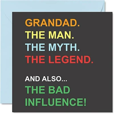 MAKE GRANDAD SMILE WITH THIS FUNNY BIRTHDAY CARD: This exceptional quality fathers day card for him shows the design "Grandad The Man The Myth The Legend Also The Bad Influence!". If you are looking for beautiful greetings cards for him, then this happy fathers day card is bound to make them smile. Not just for fathers day gifts for Grandad this could also be a birthday card for Grandad, Grandpa, Gramps or Grandfather. WHAT DO YOU GET: The card is printed on one side and BLANK ON THE INSIDE to allow you to write your very own message. The unique fun design is printed on a specially sourced and environmentally responsible board. At 360 microns thick the natural white one-sided gloss board has a quality look and feel. Supplied with a coloured gummed envelope to complement the design and ready to be sealed and sent in the post. NO INK SMUDGES: There is nothing worse than writing inside a card to find that the shiny surface makes the ink smudge. This is why we use a high quality one sided coated board. The uncoated side will absorb more of the ink from your pen to make smudging a thing of the past. Happy fathers Grandad cards, Grandad card, Grandad birthday cards. SIZES: Greeting Card = 145mm x 145mm, Envelope = 155mm x 155mm, Card Thickness = 360 micron. Great Grandad fathers day cards from Granddaughter or Grandson. Grandad birthday cards from Granddaughter, birthday cards for Grandad, Grandfather birthday card, Grandad cards from Grandson, special Grandad cards. MADE AND QUALITY CHECKED IN THE UK: We print and manufacture all our product right her in the UK so you can be sure of a fast turnaround and a product that is expertly made. Using environmentally responsible premium board our card is conscious of the responsible management of the world's forests - birthday cards Grandad, birthday card Grandfather, Grandad birthday cards, Grandads birthday card.