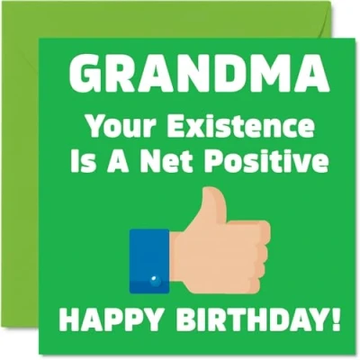 MAKE GRANDMA SMILE WITH THIS HILARIOUS HAPPY BIRTHDAY CARD GRANDMA: This exceptional quality birthday card for her shows a funny rude message "Your Existence Is A Net Positive". If you are looking for beautiful birthday greetings cards for her, then this happy fathers day card is bound to make them laugh. Not just for fathers day gifts for Grandma this could also be a birthday card for Grandma, Gran or Granny. WHAT DO YOU GET: The card is printed on one side and BLANK ON THE INSIDE to allow you to write your very own message. The unique fun design is printed on a specially sourced and environmentally responsible board. At 360 microns thick the natural white one-sided gloss board has a quality look and feel. Supplied with a coloured gummed envelope to complement the design and ready to be sealed and sent in the post. NO INK SMUDGES: There is nothing worse than writing inside a card to find that the shiny surface makes the ink smudge. This is why we use a high quality one sided coated board. The uncoated side will absorb more of the ink from your pen to make smudging a thing of the past. Happy birthday Grandma cards, Grandma birthday card, Gran birthday cards. SIZES: Greeting Card = 145mm x 145mm, Envelope = 155mm x 155mm, Card Thickness = 360 micron. Great Grandma birthday cards from Granddaughter or Grandson. Grandma birthday cards from Grandchildren, birthday cards for Grandma, birthday card Granny, Grandmother birthday card, Grandma birthday cards from Grandson, Grandma cards birthday, funny Grandma birthday cards, Grandma 70th birthday card, birthday card Grandma from Granddaughter. MADE AND QUALITY CHECKED IN THE UK: We print and manufacture all our product right her in the UK so you can be sure of a fast turnaround and a product that is expertly made. Using environmentally responsible premium board our card is conscious of the responsible management of the world's forests - birthday cards Grandma, birthday card Father, Step Grandma birthday card, Grandmas birthday card.