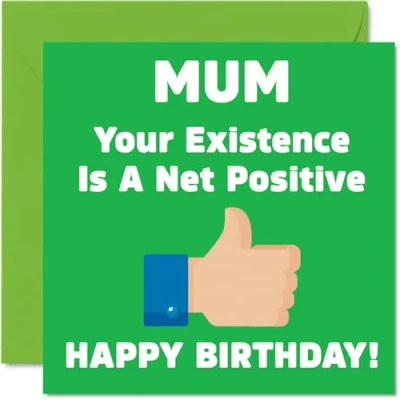 MAKE MUM LAUGH WITH THIS HILARIOUS HAPPY BIRTHDAY CARD MUM: This exceptional quality mothers day card for her shows a funny rude message "Your Existence Is A Net Positive". If you are looking for beautiful birthday greetings cards for her, then this happy mothers day card is bound to make them laugh. Not just for mothers day gifts for Mum this could also be A birthday card for Mum, Mother, Mummy, Mom, Mama, Mama, or Mommy. WHAT DO YOU GET: The card is printed on one side and BLANK ON THE INSIDE to allow you to write your very own message. The unique fun design is printed on a specially sourced and environmentally responsible board. At 360 microns thick the natural white one-sided gloss board has a quality look and feel. Supplied with a coloured gummed envelope to complement the design and ready to be sealed and sent in the post. NO INK SMUDGES: There is nothing worse than writing inside a card to find that the shiny surface makes the ink smudge. This is why we use a high quality one sided coated board. The uncoated side will absorb more of the ink from your pen to make smudging a thing of the past. Happy birthday Mum cards, Mam birthday card, Mom birthday cards. SIZES: Greeting Card = 145mm x 145mm, Envelope = 155mm x 155mm, Card Thickness = 360 micron. Great mum mothers day cards from Daughter or Son. Mum birthday cards from Daughter, birthday cards for Mum, birthday card Mum, Mother birthday card, Mum birthday cards from Son, Mum cards birthday, funny Mum birthday cards, Mum 50th birthday card, birthday card Mum from Daughter. MADE AND QUALITY CHECKED IN THE UK: We print and manufacture all our product right her in the UK so you can be sure of a fast turnaround and a product that is expertly made. Using environmentally responsible premium board our card is conscious of the responsible management of the world's forests - birthday cards Mum, birthday card Mother, Step Mum birthday card, Mums birthday card.