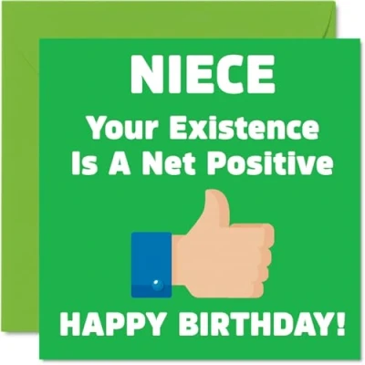 MAKE YOUR NIECE LAUGH WITH THIS HILARIOUS HAPPY BIRTHDAY CARD NIECE: This exceptional quality birthday card for her shows a funny rude message "Your Existence Is A Net Positive". If you are looking for beautiful birthday greetings cards for her, then this happy birthday card is bound to make them laugh. Not just for birthday gifts for Niece this could also be a birthday card for Niece. WHAT DO YOU GET: The card is printed on one side and BLANK ON THE INSIDE to allow you to write your very own message. The unique fun design is printed on a specially sourced and environmentally responsible board. At 360 microns thick the natural white one-sided gloss board has a quality look and feel. Supplied with a coloured gummed envelope to complement the design and ready to be sealed and sent in the post. NO INK SMUDGES: There is nothing worse than writing inside a card to find that the shiny surface makes the ink smudge. This is why we use a high quality one sided coated board. The uncoated side will absorb more of the ink from your pen to make smudging a thing of the past. Happy birthday Niece cards, Niece birthday card, Niece birthday cards. SIZES: Greeting Card = 145mm x 145mm, Envelope = 155mm x 155mm, Card Thickness = 360 micron. Great Niece birthday cards from Aunt or Uncle. Niece birthday cards from Uncle, birthday cards for Niece, birthday card Niece, Niece birthday card, Niece birthday cards from Aunt, Niece cards birthday, funny Niece birthday cards, Niece 18th birthday card, birthday card Niece from Uncle. MADE AND QUALITY CHECKED IN THE UK: We print and manufacture all our product right her in the UK so you can be sure of a fast turnaround and a product that is expertly made. Using environmentally responsible premium board our card is conscious of the responsible management of the world's forests - birthday cards Niece, birthday card Niece, Step Niece birthday card, Nieces birthday card.
