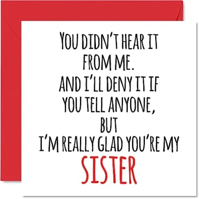 MAKE YOUR SISTER SMILE WITH THIS HILARIOUS HAPPY BIRTHDAY CARD SISTER: This exceptional quality birthday card for her shows the design "You didn't hear it from me. And i'll deny it if you tell anyone, But i'm really glad your my Sister". If you are looking for beautiful birthday greetings cards for her, then this happy birthday card is bound to make them laugh. Not just for birthday gifts for Sister this could also be a birthday card for Sister. WHAT DO YOU GET: The card is printed on one side and BLANK ON THE INSIDE to allow you to write your very own message. The unique fun design is printed on a specially sourced and environmentally responsible board. At 360 microns thick the natural white one-sided gloss board has a quality look and feel. Supplied with a coloured gummed envelope to complement the design and ready to be sealed and sent in the post. NO INK SMUDGES: There is nothing worse than writing inside a card to find that the shiny surface makes the ink smudge. This is why we use a high quality one sided coated board. The uncoated side will absorb more of the ink from your pen to make smudging a thing of the past. Happy birthday Sister cards, Sister birthday card, Sister birthday cards. SIZES: Greeting Card = 145mm x 145mm, Envelope = 155mm x 155mm, Card Thickness = 360 micron. Great Sister birthday cards from Brother or Sister. Sister birthday cards from Brother, birthday cards for Sister, birthday card Sister, Sister birthday card, Sister birthday cards from Brother, Sister cards birthday, special Sister birthday cards, Sister 18th birthday card, birthday card Sister from Brother. MADE AND QUALITY CHECKED IN THE UK: We print and manufacture all our product right her in the UK so you can be sure of a fast turnaround and a product that is expertly made. Using environmentally responsible premium board our card is conscious of the responsible management of the world's forests - birthday cards Sister, birthday card Sister, Step Sister birthday card, Sisters birthday card.