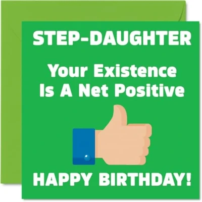 MAKE YOUR STEP-DAUGHTER LAUGH WITH THIS HILARIOUS HAPPY BIRTHDAY CARD STEP DAUGHTER: This exceptional quality birthday card for her shows a funny rude message "Your Existence Is A Net Positive". If you are looking for beautiful birthday greetings cards for her, then this happy birthday card is bound to make them laugh. Not just for birthday gifts for Step Daughter this could also be a birthday card for Step Daughter in Law. WHAT DO YOU GET: The card is printed on one side and BLANK ON THE INSIDE to allow you to write your very own message. The unique fun design is printed on a specially sourced and environmentally responsible board. At 360 microns thick the natural white one-sided gloss board has a quality look and feel. Supplied with a coloured gummed envelope to complement the design and ready to be sealed and sent in the post. NO INK SMUDGES: There is nothing worse than writing inside a card to find that the shiny surface makes the ink smudge. This is why we use a high quality one sided coated board. The uncoated side will absorb more of the ink from your pen to make smudging a thing of the past. Happy birthday Step Daughter cards, Step Daughter birthday cards. SIZES: Greeting Card = 145mm x 145mm, Envelope = 155mm x 155mm, Card Thickness = 360 micron. Great Step Daughter birthday cards from Step Mum or Step Dad, birthday cards for Step Daughter, Step Daughter cards birthday, funny Step Daughter birthday cards, Step Daughter 18th birthday card, birthday card Step Daughter, Step Daughter 21st birthday card, Step Daughter 30th birthday card. MADE AND QUALITY CHECKED IN THE UK: We print and manufacture all our product right him in the UK so you can be sure of a fast turnaround and a product that is expertly made. Using environmentally responsible premium board our card is conscious of the responsible management of the world's forests - birthday cards Step Daughter, birthday card Step Daughter, Step Daughter in Law birthday card, Step Daughters birthday card.