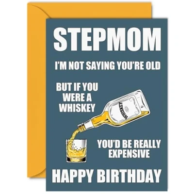 MAKE YOUR STEP MOM SMILE WITH THIS HILARIOUS HAPPY BIRTHDAY CARD STEPMOM: This exceptional quality birthday card for her shows the design "I'm not saying you're old but if you were a whiskey you'd be really expensive Happy birthday". If you are looking for beautiful birthday greetings cards for her, then this funny happy birthday card is bound to make them smile. Not just for birthday gifts for Step Mom this could also be a birthday card for your Step Mom, Step Mommy, Mama or Mother. WHAT DO YOU GET: The card is printed on one side and BLANK ON THE INSIDE to allow you to write your very own message. The unique fun design is printed on a specially sourced and environmentally responsible board. At 360 microns thick the natural white one-sided gloss board has a quality look and feel. Supplied with a coloured gummed envelope to complement the design and ready to be sealed and sent in the post. NO INK SMUDGES: There is nothing worse than writing inside a card to find that the shiny surface makes the ink smudge. This is why we use a high quality one sided coated board. The uncoated side will absorb more of the ink from your pen to make smudging a thing of the past. Happy birthday Step Mom cards, Step Mom birthday card, Step Mom birthday cards, 60th birthday card for her, 50th birthday cards for women. SIZES: Greeting Card = 148mm x 210mm, Envelope = 150mm x 212mm, Card Thickness = 360 micron. Great Step Mom birthday cards from Step Son and Step Daughter. Mom birthday cards from kids, birthday card Step Mom, Step Mom birthday card, Mom birthday cards from Step Son, special Step Mom birthday cards. MADE AND QUALITY CHECKED IN THE UK: We print and manufacture all our product right her in the UK so you can be sure of a fast turnaround and a product that is expertly made. Using environmentally responsible premium board our card is conscious of the responsible management of the world's forests.