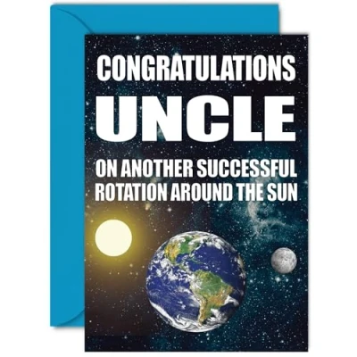 MAKE YOUR UNCLE LAUGH WITH THIS FUNNY BIRTHDAY CARD UNCLE: This exceptional quality birthday card for him shows the design "Congratulations On Another Successful Rotation Around The Sun". If you are looking for beautiful birthday greetings cards for him, then this funny happy birthday card is bound to make them smile. Not just for birthday gifts for Uncle this could also be a birthday card for your Uncle or Step Uncle. WHAT DO YOU GET: The card is printed on one side and BLANK ON THE INSIDE to allow you to write your very own message. The unique fun design is printed on a specially sourced and environmentally responsible board. At 360 microns thick the natural white one-sided gloss board has a quality look and feel. Supplied with a coloured gummed envelope to complement the design and ready to be sealed and sent in the post. NO INK SMUDGES: There is nothing worse than writing inside a card to find that the shiny surface makes the ink smudge. This is why we use a high quality one sided coated board. The uncoated side will absorb more of the ink from your pen to make smudging a thing of the past. Happy birthday Uncle cards, Uncle birthday card, Step Uncle birthday cards, 50th birthday card for him, 40th birthday cards for men. SIZES: Greeting Card = 148mm x 210mm, Envelope = 150mm x 212mm, Card Thickness = 360 micron. Great Uncle birthday cards from Niece and Nephew. Uncle birthday cards from Nephew, birthday card Uncle, Uncle birthday card, Uncle birthday cards from Niece, special Uncle birthday cards. MADE AND QUALITY CHECKED IN THE UK: We print and manufacture all our product right her in the UK so you can be sure of a fast turnaround and a product that is expertly made. Using environmentally responsible premium board our card is conscious of the responsible management of the world's forests - birthday cards Uncle, Uncle birthday card, Uncles birthday card.