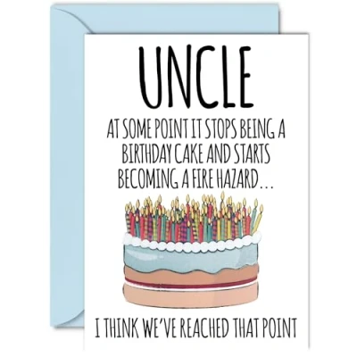 MAKE YOUR UNCLE LAUGH WITH THIS FUNNY BIRTHDAY CARD UNCLE: This exceptional quality birthday card for him shows the design "At some point it stops being a birthday cake and starts becoming a fire hazard... I think we've reached that point". If you are looking for beautiful birthday greetings cards for him, then this funny happy birthday card is bound to make them smile. Not just for birthday gifts for Uncle this could also be a birthday card for your Uncle or Step Uncle. WHAT DO YOU GET: The card is printed on one side and BLANK ON THE INSIDE to allow you to write your very own message. The unique fun design is printed on a specially sourced and environmentally responsible board. At 360 microns thick the natural white one-sided gloss board has a quality look and feel. Supplied with a coloured gummed envelope to complement the design and ready to be sealed and sent in the post. NO INK SMUDGES: There is nothing worse than writing inside a card to find that the shiny surface makes the ink smudge. This is why we use a high quality one sided coated board. The uncoated side will absorb more of the ink from your pen to make smudging a thing of the past. Happy birthday Uncle cards, Uncle birthday card, Step Uncle birthday cards, 50th birthday card for him, 40th birthday cards for men. SIZES: Greeting Card = 148mm x 210mm, Envelope = 150mm x 212mm, Card Thickness = 360 micron. Great Uncle birthday cards from Niece and Nephew. Uncle birthday cards from Nephew, birthday card Uncle, Uncle birthday card, Uncle birthday cards from Niece, special Uncle birthday cards. MADE AND QUALITY CHECKED IN THE UK: We print and manufacture all our product right her in the UK so you can be sure of a fast turnaround and a product that is expertly made. Using environmentally responsible premium board our card is conscious of the responsible management of the world's forests - birthday cards Uncle, Uncle birthday card, Uncles birthday card.
