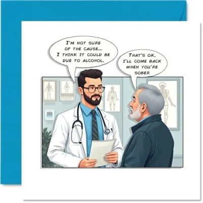 MAKE THEM SMILE WITH THIS FUNNY BIRTHDAY CARD: This exceptional quality birthday card for her or him shows a design of a doctor talking to a patient with the words Im not sure of the cause... I think it could be due to the alcohol and the patient saying thats ok I'll come back when im sober. If you are looking for fun birthday cards ,then this birthday card is bound to make them smile. This could also be for Best Friend, Mum, Grandma, Nan, Dad, Grandad, Brother, Sister, Cousin, Auntie or Uncle. WHAT DO YOU GET: The card is printed on both sides with space to allow you to write your very own message inside. The unique fun design is printed on a specially sourced and environmentally responsible board. At 360 microns thick and 300gsm the natural white one-sided gloss board has a quality look and feel. Supplied with a coloured gummed envelope to complement the design and ready to be sealed and sent in the post. 40th birthday card for him, birthday card Dad. 30th birthday cards for men NO INK SMUDGES: There is nothing worse than writing inside a card to find that the shiny surface makes the ink smudge. This is why we use a high quality one sided coated board. The uncoated side will absorb more of the ink from your pen to make smudging a thing of the past. Dad birthday cards, best friend birthday card, birthday card funny, rude birthday cards for women. SIZES: Greeting Card = 145mm x 145mm, Envelope = 155mm x 155mm, Card Thickness = 360 micron. Great friend birthday cards, male birthday card, 30th birthday card, happy birthday Dad cards, husband 50th birthday cards, stepdad birthday card. MADE AND QUALITY CHECKED IN THE UK: We print and manufacture all our product right her in the UK so you can be sure of a fast turnaround and a product that is expertly made. Using environmentally responsible premium board our card is conscious of the responsible management of the world's forests - 50th birthday cards for men, mens birthday cards, oldi card.