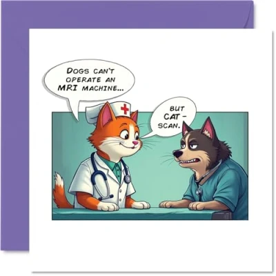 MAKE THEM SMILE WITH THIS FUNNY BIRTHDAY CARD: This exceptional quality birthday card for her or him shows a design of a Cat and a Dog talking in a hosptal with the words "dogs cant operate an MRI machine... but CAT-SCAN. If you are looking for fun birthday cards ,then this birthday card is bound to make them smile. This could also be for Best Friend, Mum, Grandma, Nan, Dad, Grandad, Brother, Sister, Cousin, Auntie or Uncle. WHAT DO YOU GET: The card is printed on both sides with space to allow you to write your very own message inside. The unique fun design is printed on a specially sourced and environmentally responsible board. At 360 microns thick and 300gsm the natural white one-sided gloss board has a quality look and feel. Supplied with a coloured gummed envelope to complement the design and ready to be sealed and sent in the post. 40th birthday card for him, birthday card Dad. 30th birthday cards for men NO INK SMUDGES: There is nothing worse than writing inside a card to find that the shiny surface makes the ink smudge. This is why we use a high quality one sided coated board. The uncoated side will absorb more of the ink from your pen to make smudging a thing of the past. Happy birthday Mum cards, Mam birthday card, Mom birthday cards. SIZES: Greeting Card = 145mm x 145mm, Envelope = 155mm x 155mm, Card Thickness = 360 micron. Great friend birthday cards, male birthday card, 30th birthday card, happy birthday Dad cards, husband 50th birthday cards, stepdad birthday card. MADE AND QUALITY CHECKED IN THE UK: We print and manufacture all our product right her in the UK so you can be sure of a fast turnaround and a product that is expertly made. Using environmentally responsible premium board our card is conscious of the responsible management of the world's forests - 50th birthday cards for men, mens birthday cards, oldi card.