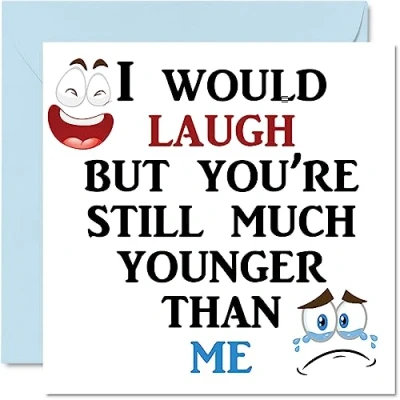 MAKE THEM SMILE WITH THIS FUNNY BIRTHDAY CARD: This exceptional quality birthday card for her or him shows the design "I Would Laugh But You're Still Much Younger Than Me". If you are looking for fun birthday cards for women, then this happy birthday card is bound to make them smile. Not just for friendship gifts for women this could also be for Best Friend, Work Colleague, Mum, Grandma, Nan, Dad, Grandad, Nanny, Colleague, Brother, Sister, Cousin, Auntie or Uncle. WHAT DO YOU GET: The card is printed on one side and BLANK ON THE INSIDE to allow you to write your very own message. The unique fun design is printed on a specially sourced and environmentally responsible board. At 360 microns thick the natural white one-sided gloss board has a quality look and feel. Supplied with a coloured gummed envelope to complement the design and ready to be sealed and sent in the post. 40th birthday card for him birthday card Dad. 30th birthday cards for men NO INK SMUDGES: There is nothing worse than writing inside a card to find that the shiny surface makes the ink smudge. This is why we use a high quality one sided coated board. The uncoated side will absorb more of the ink from your pen to make smudging a thing of the past. Dad birthday cards, best friend birthday card, birthday card funny, rude birthday cards for women. SIZES: Greeting Card = 145mm x 145mm, Envelope = 155mm x 155mm, Card Thickness = 360 micron. Great friend birthday cards, male birthday card, 30th birthday card, happy birthday Dad cards, husband 50th birthday cards, stepdad birthday card. MADE AND QUALITY CHECKED IN THE UK: We print and manufacture all our product right her in the UK so you can be sure of a fast turnaround and a product that is expertly made. Using environmentally responsible premium board our card is conscious of the responsible management of the world's forests - 50th birthday cards for men, mens birthday cards, oldi card.