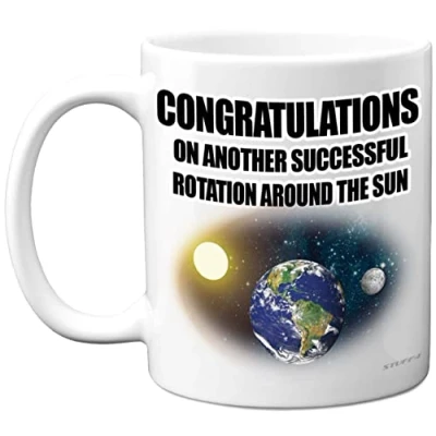 MAKE THEM SMILE ON HIS SPECIAL DAY: This exceptional quality birthday gift for her or him shows the design "Congratulations On Another Successful Rotation Around The Sun". If you are looking for funny birthday mugs for women, then then this happy birthday mug is bound to make them laugh. Not just for friendship gifts for women this could also be for Best Friend, Work Colleague, Mum, Grandma, Nan, Dad, Grandad, Nanny, Colleague, Brother, Sister, Cousin, Auntie or Uncle. WHAT DO YOU GET: This novelty mug for him or her is made from the highest quality mugs available on the market. An 11oz ceramic gloss finished mug with a large handle for ease of use. The cheeky design is printed on both sides so no one will miss it. Incredibly funny and thoughtful gifts for women and men from Stuff4 Ltd. 40th birthday gift for him, birthday gifts for Dad. PACKED FOR PROTECTION: Every order is packed in a drop proof double walled cardboard Mug Mailer which are lightweight and strong enough to provide total protection. So have the birthday boy in pieces and not the rude mugs, daddy birthday gifts, Dad birthday gifts, best friend birthday gift, birthday gifts funny, rude birthday gifts for women. MADE AND QUALITY CHECKED IN THE UK: We manufacture all our product right her in the UK so you can be sure of a fast turnaround and a product that is expertly made - for his birthday gifts. Great friend birthday gifts, male birthday gift, 30th birthday gift, happy birthday Dad gift, husband 50th birthday gift, stepdad birthday gifts. 11oz DISHWASHER AND MICROWAVE SAFE MUGS: Made from premium ceramic our 11oz heavyweight mugs are manufactured with a dishwasher safe premium coating. This means that the colours of your image will not fade from even after multiple cycles (up to 800) through a dishwasher. They are also microwave safe. 40th birthday gifts for men, mens birthday gift, oldi gifts.