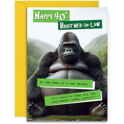 Funny Brother in Law 40th Birthday Card Grumpy Gorilla Design for Him Fun Age 40 Happy A5 Size with Yellow Envelope