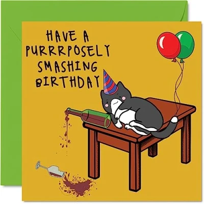 MAKE THEM SMILE WITH THIS PAW-SOME BIRTHDAY CARD: This exceptional quality birthday card shows the design of a cheeky cat knocking things of the table with the wording "Have A Purrrposely Smashing Birthday". If you are looking for fun birthday cards for men and women, then this happy birthday card is bound to make them smile.This could also be for Best Friend, Work Colleague, Mum, Dad, Brother, Uncle, Colleague, Sister, Cousin or Auntie. WHAT DO YOU GET: The card is printed on one side and BLANK ON THE INSIDE to allow you to write your very own message. The unique cheeky design is printed on a specially sourced and environmentally responsible board. At 360 microns thick the natural white one-sided gloss board has a quality look and feel. Supplied with a coloured gummed envelope to complement the design and ready to be sealed and sent in the post. NO INK SMUDGES: There is nothing worse than writing inside a card to find that the shiny surface makes the ink smudge. This is why we use a high quality one sided coated board. The uncoated side will absorb more of the ink from your pen to make smudging a thing of the past. SIZES: Greeting Card = 145mm x 145mm, Envelope = 155mm x 155mm, Card Thickness = 360 micron. MADE AND QUALITY CHECKED IN THE UK: We print and manufacture all our product right her in the UK so you can be sure of a fast turnaround and a product that is expertly made. Using environmentally responsible premium board our card is conscious of the responsible management of the world's forests.