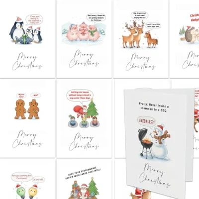 28 Hilarious Designs: A full set of 28 different Christmas joke cards, each with a unique festive pun or witty one-liner on the front to make your recipients laugh out loud. Perfect for All Ages: Family-friendly humour suitable for kids, parents, friends and colleagues alike — a fun and cheerful way to spread the Christmas spirit. No repeat designs, or jokes! Classic White Envelopes – Comes with 30 high-quality white envelopes, sized to fit the cards perfectly, giving a timeless and elegant finish. Eco-Friendly & Sustainable – Printed on responsibly sourced, fully recyclable paper, making these cards a planet-friendly way to share your Christmas greetings. Perfect Size – A6 format when folded (14.8 × 10.5 cm), ideal for handwritten personal messages without being too large or too small. The cards are printed on pearlescent cardstock which gives a lovely feel and slight shine/sparkle to them. They do make it slighly harder to write on so if you are planning on using a fountain pen these may not be the best option for you. Please consider this a set of 28 Christmas cards, you will recieve 2 more but they contain one spelling error and one American spelling. Sorry about that, it was a rather silly mistake to make. (The penguin card and the silent night cards are the ones with errors.)