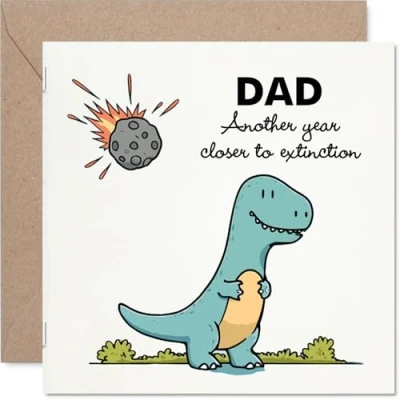 MAKE YOUR DAD LAUGH OUT LOUD WITH THIS HILARIOUS BIRTHDAY CARD: This exceptional quality Dad birthday card shows the design 'Dad Another year closer to Extinction'. If you are looking for a funny birthday card Dad, then this happy birthday Dad card is bound to make them giggle. Not just a birthday card for Dad this could also be a birthday gifts for Dad, Father or Papa. WHAT DO YOU GET: The cards are printed on both sides with the inside print saying 'Happy Birthday' and ample space for your own personal message. The funny design is printed on a specially sourced and environmentally responsible board. At 360 microns thick the natural white one-sided gloss board has a quality look and feel. Supplied with a coloured gummed envelope to complement the design and ready to be sealed and sent in the post. NO INK SMUDGES: There is nothing worse than writing inside a card to find that the shiny surface makes the ink smudge. This is why we use a high quality one sided coated board. The uncoated side will absorb more of the ink from your pen to make smudging a thing of the past. funny Dad birthday cards, cool Dad birthday cards from Son. SIZES: Greeting Card = 145mm x 145mm, Envelope = 155mm x 155mm, Card Thickness = 360 micron. Happy birthday Dad, Dads birthday card, Dad cards birthday, birthday card Dad, banter birthday Dad card, Dad gifts from Son, joke birthday card for Dad. MADE AND QUALITY CHECKED IN THE UK: We print and manufacture all our products right here in the UK so you can be sure of a fast turnaround and a product that is expertly made. Using environmentally responsible premium board our card is conscious of the responsible management of the world's forests - happy birthday card Dad funny, Dad birthday card hilarious.