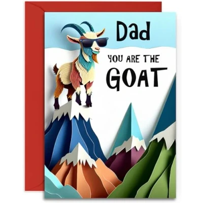 DAD FATHERS DAY OR BIRTHDAY CARD ⭐ You are the GOAT - Greatest Of All Time Design ⭐ Click the second image for the text inside the card. EXTRA THICK CARDSTOCK ⭐ 330gsm triple coated cardstock with a lovely matt inside surface for ease of writing SIZE ⭐This birthday card measure 148 x 210mm (A5 Size) and comes with a 162 x 229mm red envelope UK MANUFACTURED ⭐ A small family business. Professionally printed in our Hampshire factory ECO FRIENDLY ⭐ Our factory runs on 100% renewable energy. Our cardstock is sustainably sourced. Both the card and envelope are fully recyclable.