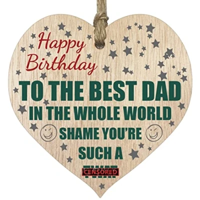 A LITTLE SOMETHING TO MAKE DAD SMILE: These exceptional quality heart shaped wooden plaque make some of the best Dad gifts on the market. A great Fathers birthday gifts shows the design "Happy Birthday To The Best Dad in the Whole World Shame You're Such a Twat" If you are looking for worlds best dad gifts then then this hanging wooden decoration is bound to make them smile. EVERY HEART IS TRUELY UNIQUE: Unlike other brands our beautiful plaques are made from raw wood and not a laminated MDF. This means that every single heart will have it's own pattern and indentation from the grain of the wood used. Each heart is hand finished with a lacquer varnish that really accentuates the deep colour of the wood and also makes the ink of the pattern/text clearer and brighter in colour. WHAT DO YOU GET: This daddy birthday gifts is made from the highest quality wooden signs and plaques. Tell dad how wonderful they are on their Birthday, Valentines, Christmas, or any time say something out of love. It can be used to hang round prosecco, champagne, wine & spirits gifts. Versatile and well-made personalised gifts for men from Stuff4 Ltd. MADE AND QUALITY CHECKED IN THE UK: We manufacture all our products right her in the UK so you can be sure of a fast turnaround and a product that is expertly made - some things i still can't tell you poems. We have the perfect dads birthday gifts available on Amazon. This beautiful heart can be used to say happy birthday daddy. EASY TO HANG: The hanging wooden heart plaque comes equipped with a small jute twine, which can be then used to hang it on somewhere for decoration. The wooden sign is convenient for you to assemble without spending your too much effort and time.