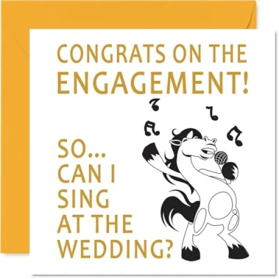 MAKE THEM LAUGHT WITH THIS HILARIOUS CONGRATULATIONS ENGAGEMENT CARD: This exceptional quality card for her or him shows the design "Congratulations On The Engagement, Can I Sing At The Wedding?". If you are looking for awesome congratulations greetings cards for women and men, then then this congrats card is bound to make them giggle. Not just a couples gifts for him or her this could also be for a engagement gifts for couples, Son, Daughter, Grandson, Granddaughter, Friend, Work Colleague WHAT DO YOU GET: The card is printed on one side and BLANK ON THE INSIDE to allow you to write your very own message. The unique fun design is printed on a specially sourced and environmentally responsible board. At 360 microns thick the natural white one-sided gloss board has a quality look and feel. Supplied with a coloured gummed envelope to complement the design and ready to be sealed and sent in the post. NO INK SMUDGES: There is nothing worse than writing inside a card to find that the shiny surface makes the ink smudge. This is why we use a high quality one sided coated board. The uncoated side will absorb more of the ink from your pen to make smudging a thing of the past. Well done cards, just to say cards, Son engagement card, engagement rate. SIZES: Greeting Card = 145mm x 145mm, Envelope = 155mm x 155mm, Card Thickness = 360 micron. Great engagement gifts for couples funny. Congratulations cards, congratulation card, engagment gifts, sister engagement card, engagement card funny, engagement cards for son and fiancee, engagement greeting cards. MADE AND QUALITY CHECKED IN THE UK: We print and manufacture all our product right her in the UK so you can be sure of a fast turnaround and a product that is expertly made. Using environmentally responsible premium board our card is conscious of the responsible management of the world's forests - funny wedding card, engagement card daughter and fiance.