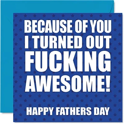 MAKE DAD SMILE WITH THIS HILARIOUS FATHERS DAY CARD DAD: This exceptional quality fathers day card for him shows the design "Because Of You I Turned Out Fucking Awesome! Happy Fathers Day". If you are looking for beautiful greetings cards for him, then this happy fathers day card is bound to make them laugh. Not just for fathers day gifts for Dad this could also be for Dad, Daddy, Papa or Father. WHAT DO YOU GET: The card is printed on one side and BLANK ON THE INSIDE to allow you to write your very own message. The unique fun design is printed on a specially sourced and environmentally responsible board. At 360 microns thick the natural white one-sided gloss board has a quality look and feel. Supplied with a coloured gummed envelope to complement the design and ready to be sealed and sent in the post. NO INK SMUDGES: There is nothing worse than writing inside a card to find that the shiny surface makes the ink smudge. This is why we use a high quality one sided coated board. The uncoated side will absorb more of the ink from your pen to make smudging a thing of the past. Happy fathers Dad cards, Dad day card, Daddy day cards. SIZES: Greeting Card = 145mm x 145mm, Envelope = 155mm x 155mm, Card Thickness = 360 micron. Great Dad fathers day cards from Daughter or Son. Dad birthday cards from Daughter, birthday cards for Dad, birthday card Daddy, Father birthday card, Dad cards from Son, Dad cards, special Dad cards, card Dad from Daughter. MADE AND QUALITY CHECKED IN THE UK: We print and manufacture all our product right her in the UK so you can be sure of a fast turnaround and a product that is expertly made. Using environmentally responsible premium board our card is conscious of the responsible management of the world's forests - birthday cards Dad, birthday card Father, Step Dad birthday card, Dads birthday card.