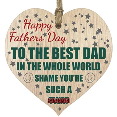 A LITTLE SOMETHING TO MAKE DAD SMILE: These exceptional quality heart shaped wooden plaque make some of the best Dad gifts on the market. A great Fathers day gifts shows the design "Happy Fathers Day To The Best Dad in the Whole World Shame You're Such a Twat" If you are looking for worlds best dad gifts then then this hanging wooden decoration is bound to make them smile. EVERY HEART IS TRUELY UNIQUE: Unlike other brands our beautiful plaques are made from raw wood and not a laminated MDF. This means that every single heart will have it's own pattern and indentation from the grain of the wood used. Each heart is hand finished with a lacquer varnish that really accentuates the deep colour of the wood and also makes the ink of the pattern/text clearer and brighter in colour. WHAT DO YOU GET: This daddy gifts is made from the highest quality wooden signs and plaques. Tell dad how wonderful they are on their Birthday, Valentines, Christmas, or any time say something out of love. It can be used to hang round prosecco, champagne, wine & spirits gifts. Versatile and well-made personalised gifts for men from Stuff4 Ltd. MADE AND QUALITY CHECKED IN THE UK: We manufacture all our products right her in the UK so you can be sure of a fast turnaround and a product that is expertly made - some things i still can't tell you poems. We have the perfect dad gifts available on Amazon. This beautiful heart can be used to say happy fathers day daddy. EASY TO HANG: The hanging wooden heart plaque comes equipped with a small jute twine, which can be then used to hang it on somewhere for decoration. The wooden sign is convenient for you to assemble without spending your too much effort and time.