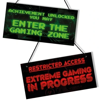 GAMING SIGN – Pack contains 1 double sided sign and 1 length of black cord. Sign has 2 x holes to allow hanging with cord, simply thread cord through hole and knot. MADE IN THE UK – Designed, printed and packed in the UK. TWO MESSAGES ON ONE SIGN – Side 1: Achievement Unlocked you may enter the Gaming Zone. Side 2: Restricted Access. Extreme Gaming in Progress. PREMIUM QUALITY THICK BOARD – We only use good quality 5mm rigid foamboard for our signs which is also waterproof. LIGHT FAST INKS - The ink used for these signs is light fast, meaning it wont fade in day light.