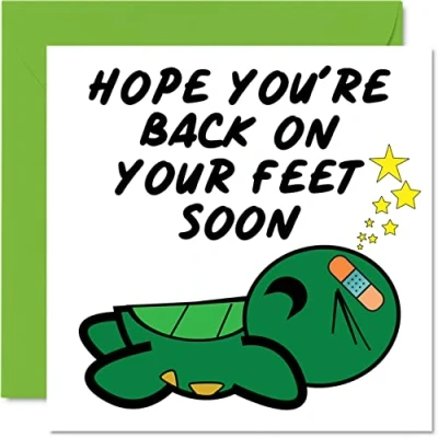 MAKE THEM LAUGH WITH THIS FUNNY GET WELL CARD: This exceptional quality get well soon cards for women or men shows the design "Hope your back on your feet soon". If you are looking for funny get well cards for women, then then this get well cards for colleagues is bound to make them smile. Not just for get well soon cards for women this could also be for Work Colleague, Best Friend, Brother, Sister, Mum or Dad. WHAT DO YOU GET: The card is printed on one side and BLANK ON THE INSIDE to allow you to write your very own message. The unique fun design is printed on a specially sourced and environmentally responsible board. At 360 microns thick the natural white one-sided gloss board has a quality look and feel. Supplied with a coloured gummed envelope to complement the design and ready to be sealed and sent in the post. NO INK SMUDGES: There is nothing worse than writing inside a card to find that the shiny surface makes the ink smudge. This is why we use a high quality one sided coated board. The uncoated side will absorb more of the ink from your pen to make smudging a thing of the past. Get well card for men, funny card, get well soon card for kids. SIZES: Greeting Card = 145mm x 145mm, Envelope = 155mm x 155mm, Card Thickness = 360 micron. Great friend get well soon cards from bestfriend. Get well cards for men, sorry you are leaving card, humorous gifts, get well soon card for friends. MADE AND QUALITY CHECKED IN THE UK: We print and manufacture all our product right her in the UK so you can be sure of a fast turnaround and a product that is expertly made. Using environmentally responsible premium board our card is conscious of the responsible management of the world's forests - funny gifts, leaving cards for colleagues funny, soon youll get better.