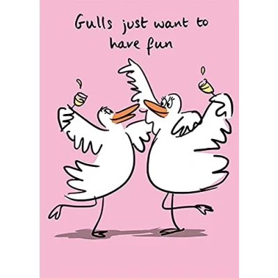 Fantastic Lucilla Lavender Greeting Card Features an illustrated pair of seagulls partying Outside reads: Gulls just want to have fun Inside is blank for your own message Measures: 134 x 181 mm