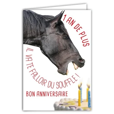 Funny Happy Birthday Card 1 Year Plus with Illustrated Envelope 17.5 x 12 cm Horse Blowing Candles on a Cake Design Made in France 69 6209