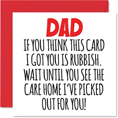 MAKE DAD SMILE WITH THIS HILARIOUS HAPPY BIRTHDAY CARD DAD: This exceptional quality birthday card for him shows the design "Dad If you think this card i got you is rubbish. Wait until you see the care home i've picked out for you!". If you are looking for beautiful birthday greetings cards for him, then this happy fathers day card is bound to make them laugh. Not just for fathers day gifts for Dad this could also be a birthday card for Dad, Daddy, Papa or Father. WHAT DO YOU GET: The card is printed on one side and BLANK ON THE INSIDE to allow you to write your very own message. The unique fun design is printed on a specially sourced and environmentally responsible board. At 360 microns thick the natural white one-sided gloss board has a quality look and feel. Supplied with a coloured gummed envelope to complement the design and ready to be sealed and sent in the post. NO INK SMUDGES: There is nothing worse than writing inside a card to find that the shiny surface makes the ink smudge. This is why we use a high quality one sided coated board. The uncoated side will absorb more of the ink from your pen to make smudging a thing of the past. Happy birthday Dad cards, Dad birthday card, Daddy birthday cards. SIZES: Greeting Card = 145mm x 145mm, Envelope = 155mm x 155mm, Card Thickness = 360 micron. Great Dad fathers day cards from Daughter or Son. Dad birthday cards from Daughter, birthday cards for Dad, birthday card Daddy, Father birthday card, Dad birthday cards from Son, Dad cards birthday, special Dad birthday cards, Dad 50th birthday card, birthday card Dad from Daughter. MADE AND QUALITY CHECKED IN THE UK: We print and manufacture all our product right here in the UK so you can be sure of a fast turnaround and a product that is expertly made. Using environmentally responsible premium board our card is conscious of the responsible management of the world's forests - birthday cards Dad, birthday card Father, Step Dad birthday card, Dads birthday card.