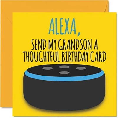 MAKE YOUR GRANDSON LAUGH WITH THIS HILARIOUS HAPPY BIRTHDAY CARD GRANDSON: This exceptional quality birthday card for her shows the design 'Alexa, Send My grandson a Thoughtful Birthday Card'. If you are looking for beautiful birthday greetings cards for her, then this happy birthday card is bound to make them laugh. Not just for birthday gifts for grandson this could also be a birthday card for your grandson. WHAT DO YOU GET: The card is printed on one side and BLANK ON THE INSIDE to allow you to write your very own message. The unique fun design is printed on a specially sourced and environmentally responsible board. At 360 microns thick the natural white one-sided gloss board has a quality look and feel. Supplied with a coloured gummed envelope to complement the design and ready to be sealed and sent in the post. NO INK SMUDGES: There is nothing worse than writing inside a card to find that the shiny surface makes the ink smudge. This is why we use a high quality one sided coated board. The uncoated side will absorb more of the ink from your pen to make smudging a thing of the past. Happy birthday grandson cards, grandson birthday cards. SIZES: Greeting Card = 145mm x 145mm, Envelope = 155mm x 155mm, Card Thickness = 360 micron. Great grandson birthday cards from Nanny or Grandad. grandson birthday cards from grandparents, birthday cards for grandson, birthday card grandson, grandson birthday card, grandson cards birthday, special grandson birthday cards, grandson 16th birthday card. MADE AND QUALITY CHECKED IN THE UK: We print and manufacture all our product right him in the UK so you can be sure of a fast turnaround and a product that is expertly made. Using environmentally responsible premium board our card is conscious of the responsible management of the world's forests - birthday cards grandson, birthday card grandson, grandsons birthday card.