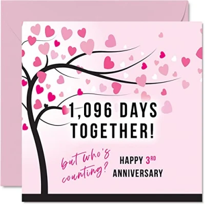 MAKE THEM LAUGH WITH THIS FUNNY 3rd ANNIVERSARY CARD: This exceptional quality anniversary gifts for him or her shows the design 1096 days together but who's counting? Happy 3rd Wedding Anniversary. If you are looking for cheeky anniversary cards for women, then then this happy wedding anniversary card is bound to make them laugh. Not just for friendship gifts for women this could also be for Husband, Wife, Partner, Fiance or Fiancee. WHAT DO YOU GET: The card is printed on one side and BLANK ON THE INSIDE to allow you to write your very own message. The unique fun design is printed on a specially sourced and environmentally responsible board. At 360 microns thick the natural white one-sided gloss board has a quality look and feel. Supplied with a coloured gummed envelope to complement the design and ready to be sealed and sent in the post. Valentines card husband, funny valentines cards, engagement card. NO INK SMUDGES: There is nothing worse than writing inside a card to find that the shiny surface makes the ink smudge. This is why we use a high quality one sided coated board. The uncoated side will absorb more of the ink from your pen to make smudging a thing of the past. Anniversary card for husband, anniversary cards for couples uk, husband anniversary cards. Leather anniversary card funny. SIZES: Greeting Card = 145mm x 145mm, Envelope = 155mm x 155mm, Card Thickness = 360 micron. Great husband or wife anniversary cards. Anniversary card for him, wedding anniversary cards wife, 3rd wedding anniversary gifts, 3rd anniversary cards. MADE AND QUALITY CHECKED IN THE UK: We print and manufacture all our product right her in the UK so you can be sure of a fast turnaround and a product that is expertly made. Using environmentally responsible premium board our card is conscious of the responsible management of the world's forests - 3 wedding anniversary cards.