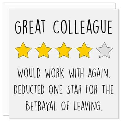 HUMOROUS DESIGN FOR OFFICE GOODBYES: This funny leaving card for colleagues is perfect for anyone who wants to inject a little humour into a workplace farewell. The witty 4-star "review-style" message is ideal for men or women leaving their job, and works for promotions, resignations, or retirements. Whether you need a coworker leaving card or a general office farewell card, this design is guaranteed to make your colleague laugh. PREMIUM PRINT QUALITY AND MATERIALS: Each card is professionally printed on thick 415 micron board for a luxurious, high-quality feel. Measuring 150mm x 150mm, it’s the perfect square greeting card size for a standout leaving message. The design is vibrant and clean, printed to the highest standards to ensure your card looks great on any desk or mantle. INCLUDES WHITE SELF-SEAL ENVELOPE: We include a high-quality 120gsm white envelope with every card – no flimsy paper here. The self-seal flap makes it easy to prepare, especially if you’re passing it around the office. Whether you're giving it in person or sending it by post, it’s a complete package ready for gifting. BLANK INSIDE FOR PERSONAL MESSAGES: This colleague leaving card is blank inside, giving you plenty of space to add your own goodbye message – whether you’re saying thank you for their hard work, good luck in their next role, or just having a joke about their "betrayal of leaving." It’s suitable as a funny coworker goodbye card, or as a heartfelt colleague thank you card. DESIGNED, PRINTED & MADE IN BRITAIN: Proudly made in Lancashire, UK, this card is part of our British-made collection and we are officially accredited by the Made in Britain organisation. If you're looking for a made in Britain greeting card with personality and quality, this is an ideal choice for supporting local design and print businesses.