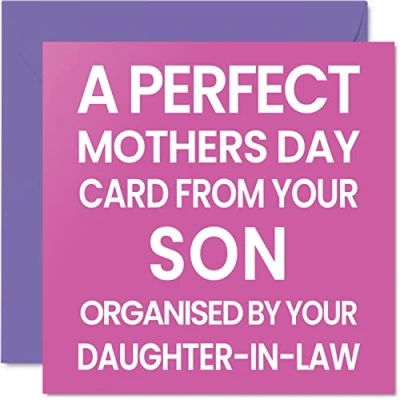 MAKE MUM SMILE WITH THIS HILARIOUS MOTHERS DAY CARD: This exceptional quality mothers day card for her shows the design "A Perfect Mothers Day Card From Your Son Organised By Your Daughter-In-Law". If you are looking for beautiful greetings cards for her, then this happy mothers day card is bound to make them laugh. Not just for mothers day gifts for Mum this could also be for Mother, Mummy, Mom, Mama, Mama, or Mommy. WHAT DO YOU GET: The card is printed on one side and BLANK ON THE INSIDE to allow you to write your very own message. The unique fun design is printed on a specially sourced and environmentally responsible board. At 360 microns thick the natural white one-sided gloss board has a quality look and feel. Supplied with a coloured gummed envelope to complement the design and ready to be sealed and sent in the post. NO INK SMUDGES: There is nothing worse than writing inside a card to find that the shiny surface makes the ink smudge. This is why we use a high quality one sided coated board. The uncoated side will absorb more of the ink from your pen to make smudging a thing of the past. Happy mothers day Mum cards, Mam birthday card, Mom birthday cards. SIZES: Greeting Card = 145mm x 145mm, Envelope = 155mm x 155mm, Card Thickness = 360 micron. Great mum mothers day cards from Daughter or Son. Mum birthday cards from Daughter, cards for Mum, card Mum, Mother day card, Mum day cards from Son, Mum cards birthday, special Mum birthday cards, mothers card Mum from Daughter. MADE AND QUALITY CHECKED IN THE UK: We print and manufacture all our product right her in the UK so you can be sure of a fast turnaround and a product that is expertly made. Using environmentally responsible premium board our card is conscious of the responsible management of the world's forests - birthday cards Mum, birthday card Mother, Step Mum birthday card, Mums birthday card.