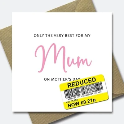 FUNNY REDUCED PRICE MOTHER'S DAY CARD - Choose from 8 variations! HIGH QUALITY - Printed on 350gsm white card stock manufactured in the UK from sustainable sources. BLANK INSIDE - Our cards are blank on the inside leaving plenty of room for you to write your own personal message. SIZE - 14.4cm wide by 14.4cm tall. PACKAGING - Posted royal mail second class in a hard backed envelope with the words DO NOT BEND on the envelope. ENVELOPE INCLUDED - Includes a free brown ribbed envelope to forward the card onto your recipient. LOCAL - The Cards Man are based in Driffield, East Yorkshire. We are a independent card shop who pride ourselves on our high quality products and excellent customer service.