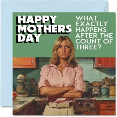 MAKE MUM SMILE WITH THIS HILARIOUS MOTHERS DAY CARD: This exceptional quality hilarious mothers day card for her shows the design of a serious mum standing in the kitchen with her arms crossed with the words "Happy Mothers Day, What Exactly Happens After The Count Of Three?". If you are looking for cheeky greetings cards for her, then this happy mothers day card is bound to make them laugh. Not just for mothers day gifts for Mum this could also be for Mother, Mummy, Mom, Mama, Mama, or Mommy. WHAT DO YOU GET: The card is printed on one side and BLANK ON THE INSIDE to allow you to write your very own message. The unique fun design is printed on a specially sourced and environmentally responsible board. At 360 microns thick the natural white one-sided gloss board has a quality look and feel. Supplied with a coloured gummed envelope to complement the design and ready to be sealed and sent in the post. NO INK SMUDGES: There is nothing worse than writing inside a card to find that the shiny surface makes the ink smudge. This is why we use a high quality one sided coated board. The uncoated side will absorb more of the ink from your pen to make smudging a thing of the past. Happy mothers day Mum cards, Mam Mothers Day card, Mom Mothers Day cards. SIZES: Greeting Card = 145mm x 145mm, Envelope = 155mm x 155mm, Card Thickness = 360 micron. Great mum mothers day cards from Daughter or Son. Mum cards from Daughter, cards for Mum, card Mum, Mother day card, Mum day cards from Son, Mum cards Mothers Day, special Mum Mothers Day cards, mothers card Mum from Daughter. MADE AND QUALITY CHECKED IN THE UK: We print and manufacture all our product right her in the UK so you can be sure of a fast turnaround and a product that is expertly made. Using environmentally responsible premium board our card is conscious of the responsible management of the world's forests - Mothers Day cards Mum, Mothers Day card Mother, Step Mum Mothers Day card, Mums Mothers Day card.