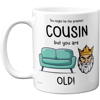 MAKE YOUR COUSIN LAUGH ON THEIR SPECIAL DAY: If you are looking for the perfect Birthday Gift for your Cousin then look no further. This exceptional quality mug bears the design 'You might be the greatest Cousin but you are Sofa King old!'. Use for all occasions such as Bday, Birthday, Christmas or at any point to show your appreciation. Special Birthday gifts for Relative from Cousin or Relative. WHAT DO YOU GET: This novelty mug for Their is made from the highest quality mugs available on the market. An 11oz ceramic gloss finished mug with a large handle for ease of use. The cheeky design is printed on both sides so no one will miss it. Incredibly funny and thoughtful gifts for men from Stuff4 Ltd. Cousin Birthday gifts. PACKED FOR PROTECTION: Every order is packed in a drop proof double walled cardboard Mug Mailer which are lightweight and strong enough to provide total protection. So have your Relative in pieces and not the fun mug.Bday gifts from Cousin, Relative Birthday gift, Family Birthday gifts, Bday gifts, Cousin mugs. MADE AND QUALITY CHECKED IN THE UK: We manufacture all our product right here in the UK so you can be sure of a fast turnaround and a product that is expertly made - for Cousin Birthday gifts. Great Cousin Bday gifts from Cousin or Relative. Relative Birthday present from Cousin, Family gift Cousin, Bday present for Relative, Familys Birthday presents, Bday gifts from Relative, funny Bday gift. 11oz DISHWASHER AND MICROWAVE SAFE MUGS: Made from premium ceramic our 11oz heavyweight mugs are manufactured with a dishwasher safe premium coating. This means that the colours of your image will not fade from even after multiple cycles (up to 800) through a dishwasher and they are also microwave safe.happy Birthday gift Cousin, Relative Bday gifts.