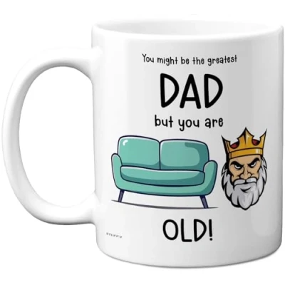 MAKE YOUR DAD LAUGH ON HIS SPECIAL DAY: If you are looking for the perfect Birthday Gift for your Dad then look no further. This exceptional quality mug bears the design 'You might be the greatest Dad but you are Sofa King old!'. Use for all occasions such as Fathers Day, Birthday, Christmas or at any point to show your appreciation. Special Birthday gifts for Parent from Son or Daughter. WHAT DO YOU GET: This novelty mug for His is made from the highest quality mugs available on the market. An 11oz ceramic gloss finished mug with a large handle for ease of use. The cheeky design is printed on both sides so no one will miss it. Incredibly funny and thoughtful gifts for men from Stuff4 Ltd. Dad Birthday gifts. PACKED FOR PROTECTION: Every order is packed in a drop proof double walled cardboard Mug Mailer which are lightweight and strong enough to provide total protection. So have your Parent in pieces and not the fun mug.Fathers Day gifts from Son, Parent Birthday gift, Father Birthday gifts, Fathers Day gifts, Dad mugs. MADE AND QUALITY CHECKED IN THE UK: We manufacture all our product right here in the UK so you can be sure of a fast turnaround and a product that is expertly made - for Dad Birthday gifts. Great Dad Fathers Day gifts from Son or Daughter. Parent Birthday present from Son, Father gift Dad, Fathers Day present for Parent, Fathers Birthday presents, Fathers Day gifts from Daughter, funny Fathers Day gift. 11oz DISHWASHER AND MICROWAVE SAFE MUGS: Made from premium ceramic our 11oz heavyweight mugs are manufactured with a dishwasher safe premium coating. This means that the colours of your image will not fade from even after multiple cycles (up to 800) through a dishwasher and they are also microwave safe.happy Birthday gift Dad, Parent Fathers Day gifts.