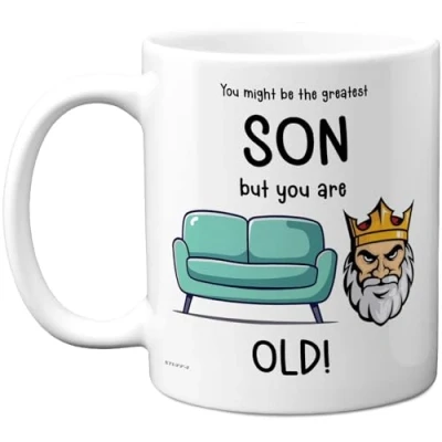 MAKE YOUR SON LAUGH ON HIS SPECIAL DAY: If you are looking for the perfect Birthday Gift for your Son then look no further. This exceptional quality mug bears the design 'You might be the greatest Son but you are Sofa King old!'. Use for all occasions such as Bday, Birthday, Christmas or at any point to show your appreciation. Special Birthday gifts for Step Son from Dad or Mum. WHAT DO YOU GET: This novelty mug for His is made from the highest quality mugs available on the market. An 11oz ceramic gloss finished mug with a large handle for ease of use. The cheeky design is printed on both sides so no one will miss it. Incredibly funny and thoughtful gifts for men from Stuff4 Ltd. Son Birthday gifts. PACKED FOR PROTECTION: Every order is packed in a drop proof double walled cardboard Mug Mailer which are lightweight and strong enough to provide total protection. So have your Step Son in pieces and not the fun mug.Bday gifts from Dad, Step Son Birthday gift, Step Child Birthday gifts, Bday gifts, Son mugs. MADE AND QUALITY CHECKED IN THE UK: We manufacture all our product right here in the UK so you can be sure of a fast turnaround and a product that is expertly made - for Son Birthday gifts. Great Son Bday gifts from Dad or Mum. Step Son Birthday present from Dad, Step Child gift Son, Bday present for Step Son, Step Childs Birthday presents, Bday gifts from Mum, funny Bday gift. 11oz DISHWASHER AND MICROWAVE SAFE MUGS: Made from premium ceramic our 11oz heavyweight mugs are manufactured with a dishwasher safe premium coating. This means that the colours of your image will not fade from even after multiple cycles (up to 800) through a dishwasher and they are also microwave safe.happy Birthday gift Son, Step Son Bday gifts.