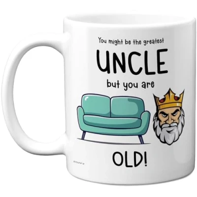 MAKE YOUR UNCLE LAUGH ON HIS SPECIAL DAY: If you are looking for the perfect Birthday Gift for your Uncle then look no further. This exceptional quality mug bears the design 'You might be the greatest Uncle but you are Sofa King old!'. Use for all occasions such as Fathers Day, Birthday, Christmas or at any point to show your appreciation. Special Birthday gifts for Relative from Nephew or Niece. WHAT DO YOU GET: This novelty mug for His is made from the highest quality mugs available on the market. An 11oz ceramic gloss finished mug with a large handle for ease of use. The cheeky design is printed on both sides so no one will miss it. Incredibly funny and thoughtful gifts for men from Stuff4 Ltd. Uncle Birthday gifts. PACKED FOR PROTECTION: Every order is packed in a drop proof double walled cardboard Mug Mailer which are lightweight and strong enough to provide total protection. So have your Relative in pieces and not the fun mug.Fathers Day gifts from Nephew, Relative Birthday gift, Family Birthday gifts, Fathers Day gifts, Uncle mugs. MADE AND QUALITY CHECKED IN THE UK: We manufacture all our product right here in the UK so you can be sure of a fast turnaround and a product that is expertly made - for Uncle Birthday gifts. Great Uncle Fathers Day gifts from Nephew or Niece. Relative Birthday present from Nephew, Family gift Uncle, Fathers Day present for Relative, Familys Birthday presents, Fathers Day gifts from Niece, funny Fathers Day gift. 11oz DISHWASHER AND MICROWAVE SAFE MUGS: Made from premium ceramic our 11oz heavyweight mugs are manufactured with a dishwasher safe premium coating. This means that the colours of your image will not fade from even after multiple cycles (up to 800) through a dishwasher and they are also microwave safe.happy Birthday gift Uncle, Relative Fathers Day gifts.