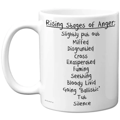 MAKE THEM SMILE ON THEIR SPECIAL DAY: This exceptional quality birthday gift for her or him shows the design "Rising Stages of Anger: Slightly put out, Miffed, Disgruntled, Cross, Exasperated, Fuming, Seething, Bloody Livid, Going "Ballistic", Tut, Silence". If you are looking for funny birthday mugs for women, then then this happy birthday mug for Work Colleague, Mum, Grandma, Nan, Dad, Grandad, Nanny, Colleague, Brother, Sister, Cousin, Auntie or Uncle is bound to make them laugh. WHAT DO YOU GET: This novelty mug for him or her is made from the highest quality mugs available on the market. An 11oz ceramic gloss finished mug with a large handle for ease of use. The cheeky design is printed on both sides so no one will miss it. Incredibly funny and thoughtful gifts for women and men from Stuff4 Ltd. PACKED FOR PROTECTION: Every order is packed in a drop proof double walled cardboard Mug Mailer which are lightweight and strong enough to provide total protection. So have the birthday boy in pieces and not the rude mugs, uncle birthday gifts. MADE AND QUALITY CHECKED IN THE UK: We manufacture all our product right her in the UK so you can be sure of a fast turnaround and a product that is expertly made - for his birthday gifts. 11oz DISHWASHER AND MICROWAVE SAFE MUGS: Made from premium ceramic our 11oz heavyweight mugs are manufactured with a dishwasher safe premium coating. This means that the colours of your image will not fade from even after multiple cycles (up to 800) through a dishwasher. They are also microwave safe.