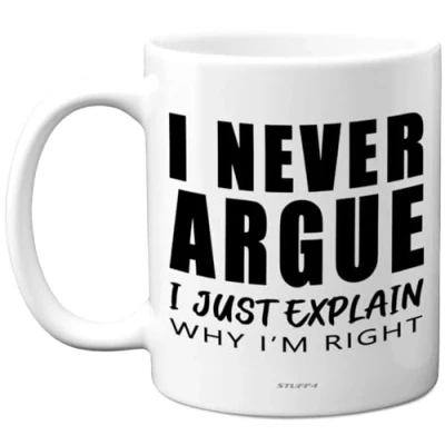 MAKE HER THEM SMILE WITH THIS FUNNY MUG: This exceptional quality novelty gift mug shows the design "I Never Argue, I Just Explain Why I'm Right". If you are looking for funny mugs then then this cheeky mug is bound to make them laugh. This could also be for Best Friend, Work Colleague, Mum, Grandma, Nan, Dad, Grandad, Nanny, Colleague, Brother, Sister, Cousin, Auntie or Uncle. WHAT DO YOU GET: This novelty mug for him or her is made from the highest quality mugs available on the market. An 11oz ceramic gloss finished mug with a large handle for ease of use. The cheeky design is printed on both sides so no one will miss it. Incredibly funny and thoughtful gifts for women and men from Stuff4 Ltd. PACKED FOR PROTECTION: Every order is packed in a drop proof double walled cardboard Mug Mailer which are lightweight and strong enough to provide total protection. MADE AND QUALITY CHECKED IN THE UK: We manufacture all our product right her in the UK so you can be sure of a fast turnaround and a product that is expertly made. 11oz DISHWASHER AND MICROWAVE SAFE MUGS: Made from premium ceramic our 11oz heavyweight mugs are manufactured with a dishwasher safe premium coating. This means that the colours of your image will not fade from even after multiple cycles (up to 800) through a dishwasher. They are also microwave safe.