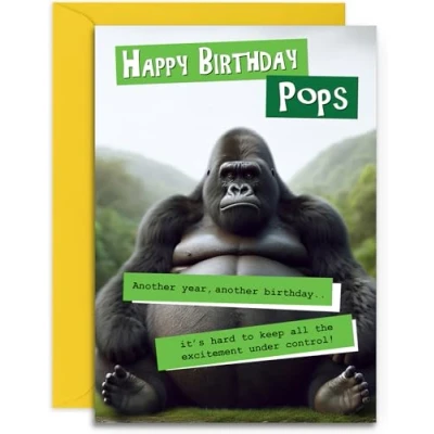 Funny Pops Birthday Card Grumpy Gorilla Design for Him Fun Happy A5 Size with Yellow Envelope