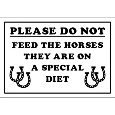 Funny Sign DON'T FEED THE HORSES SPECIAL DIET farm, safari, zoo, animals 1.2mm rigid plastic 200mm x 150mm Digitally printed and laminated for extra durability Drill and screw in position or use double sided tape to mount onto suitable surface.