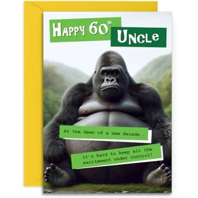 Funny Uncle 60th Birthday Card Grumpy Gorilla Design for Him Fun Age 60 Happy A5 Size with Yellow Envelope
