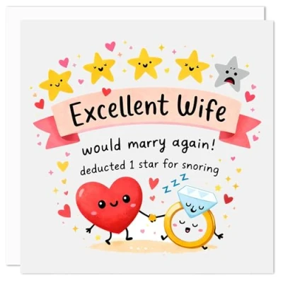 FUNNY & ROMANTIC CARD FOR YOUR WIFE- This funny wife card is the perfect mix of love and humour, making it ideal as an anniversary card for wife or a Valentines card for wife. Featuring a playful snoring joke and a sweet romantic message, it’s designed for wives or partners who want a humorous anniversary card that still shows genuine affection. IDEAL FOR ANNIVERSARIES & VALENTINE'S DAY - Whether you’re celebrating your wedding anniversary or looking for a Valentines Day card for your wife, this humorous wife card makes a memorable choice. The light-hearted marriage humour and cute illustration make it suitable for long-married couples or newlyweds alike, offering a romantic yet funny way to say “I love you”. BLANK INSIDE FOR YOUR OWN MESSAGE - This funny anniversary card for wife is left blank inside, giving you plenty of space to write a personal message, romantic note, or cheeky joke. Perfect as a card for wife from husband, it allows you to tailor your message for anniversaries, Valentine’s Day, or any special occasion. PREMIUM QUALITY LUXURY GREETING CARD - Printed on thick 415-micron high quality card, this luxury greeting card measures 150 x 150mm and feels sturdy and premium in hand. Each card comes with a quality 120gsm white self-seal envelope, making it ready to gift as a premium wife anniversary card or valentines card. DESIGN AND PRINTED IN THE UK - Proudly designed and printed in Lancashire, this British made greeting card is produced to high standards and is accredited by Made in Britain. Choosing this card means supporting UK printing and craftsmanship while giving your husband a unique, high-quality funny card he’ll genuinely appreciate.