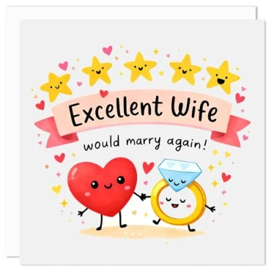 FUNNY & ROMANTIC CARD FOR YOUR WIFE - This funny wife card combines warmth and gentle humour, making it an ideal anniversary card for wives or Valentines card for your wife. Featuring the playful message “Excellent Wife Would Marry Again,” it’s perfect for showing love and appreciation in a light-hearted way without being over the top. IDEAL FOR ANNIVERSARIES & VALENTINE'S DAY - Designed as a versatile wife anniversary card and romantic Valentines Day card for wife, this design suits both special milestones and everyday celebrations of love. Whether you’re buying a wedding anniversary card from husband or a valentines card from husband, it’s a thoughtful and charming choice. BLANK INSIDE FOR YOUR OWN MESSAGE - This romantic wife card is blank inside, giving you plenty of space to write your own message. Whether heartfelt, funny, or sentimental, you can personalise it easily, making it a meaningful card for wife from husband for anniversaries, Valentine’s Day, or just because. PREMIUM QUALITY LUXURY GREETING CARD - Printed on thick 415-micron premium card, this square greeting card measures 150 x 150mm and feels sturdy and high quality. Each card includes a 120gsm white self-seal envelope, making it a luxury greeting card that’s ready to gift. DESIGN AND PRINTED IN THE UK - Proudly designed and printed in Lancashire, this British made greeting card is produced to a high standard and is accredited by Made in Britain. It’s an excellent choice for customers looking for a UK printed greeting card that supports British manufacturing and craftsmanship.